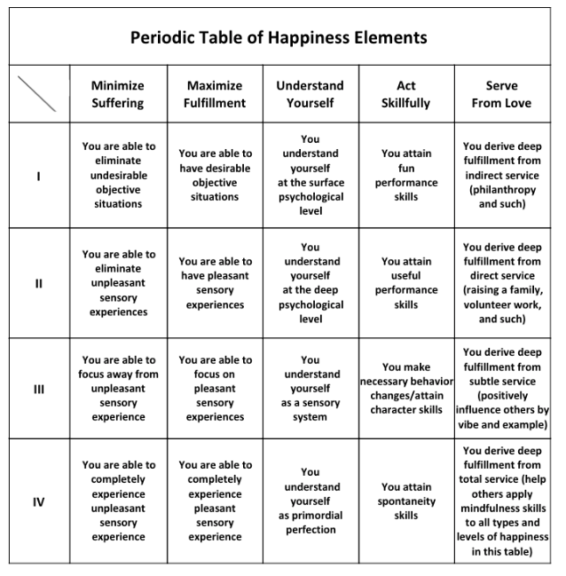 One of my favourite resources is Shinzen Young’s Happiness Grid. Here it is: